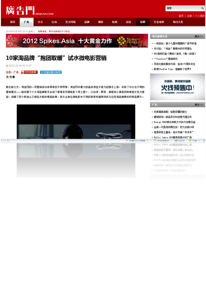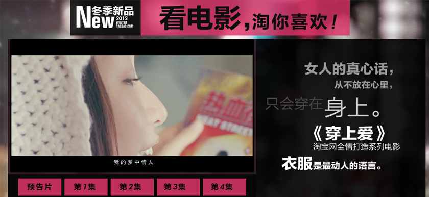 背景:2012年的十月,有点不寻常。作为淘宝最大的品类:淘宝女装,为了迎接冬上新,采取了和往年不同的营销模式:组织旗下十大卖家联手合拍爱情微电影,而且不是一部,出手就是四部。