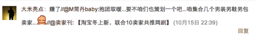 @电商报 微博点评到:淘宝联合10个卖家推出的系列网络短剧,将各家产品整合入短剧中进行营销。那些没有精力独拍小电影的卖家有福了。内容营销大行其道的今天,卖家也要考虑如何抱团取暖了。更有博友纷纷表示准备效仿。