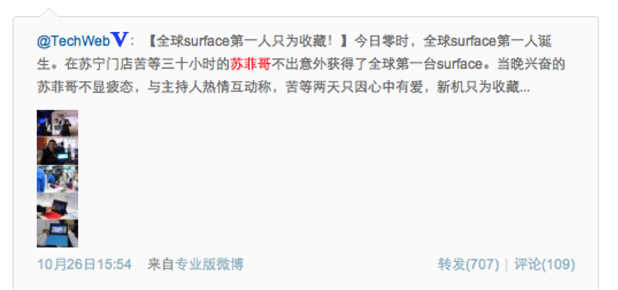 特别值得一提的是,由于时差的问题,这次中国消费者将拿到Surface全球正式发售的第一台。听到这个消息,有消费者提前30个小时在门店苦等,而这个信息被苏宁微博组敏锐的抓到了。苏宁微博不仅第一时间关注了这个普通消费者,在这漫长的30个小时里,还发动网友和他沟通,询问他需要什么东西,给他讲笑话。因为Surface的谐音,加之熬夜等待,网友还给他起了一个有趣的名字“苏菲哥”。电脑报、南都周刊、Techweb、新浪数码等媒体都在第一时间做了报道。