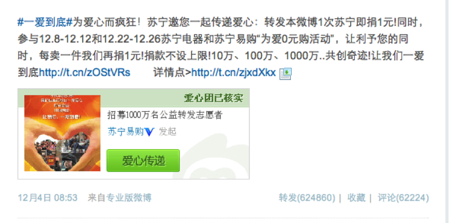 事件三:“苏宁电器、苏宁易购联合发起“转一次捐一元”公益活动”