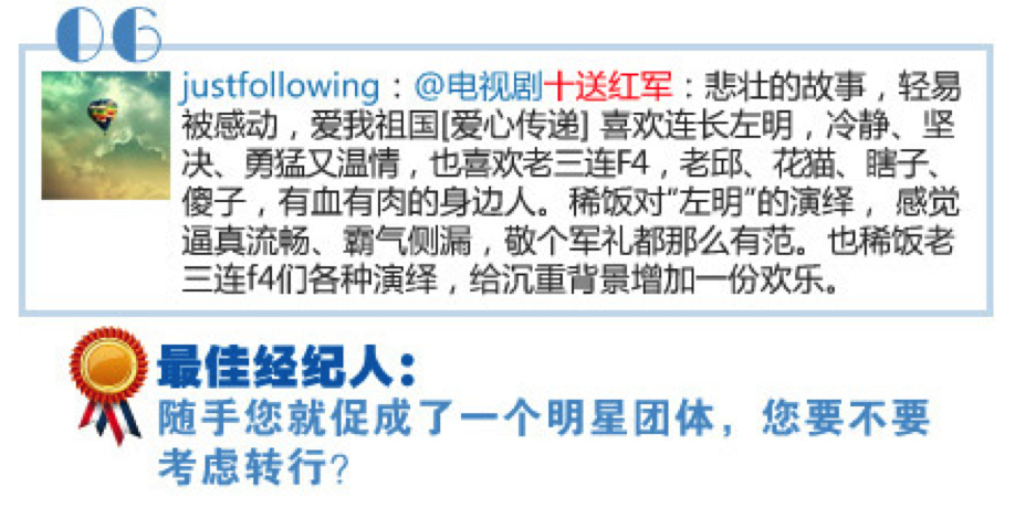 电视剧开播之前,#红军在身边#的地面活动得到了@圈少爷、@韩饭桶、@清华南都等微博名人的关注并以此形成扩散,在18-25岁的用户占其核心用户65%的新浪微博上为开播做足了铺垫。
