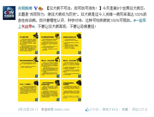 明星参与带动的火爆情况下,它基金官方微博账号发起狂犬病九问,@央视新闻、@人民日报 等权威媒体的新媒体渠也加入到一起系上灰丝带行动中。